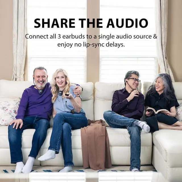 [SHARED TV AUDIO] The HT3831 set comes with 3 pairs of earbuds and a 2-in-1 transmitter / charging dock, allowing you to connect all 3 to a single audio source (like your TV) with no lip-sync delays. Choose among clear dialogue, bass-enhanced, and balanced EQ modes to further bolster your audio experience.
