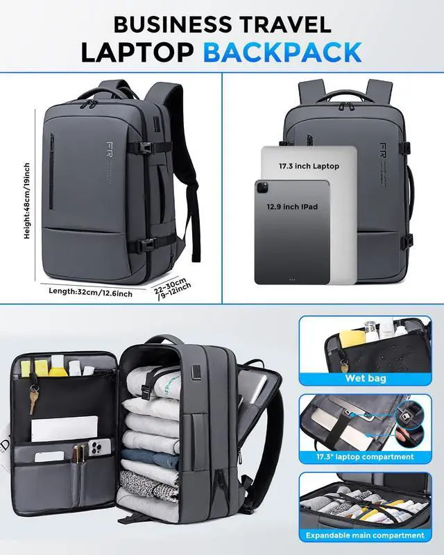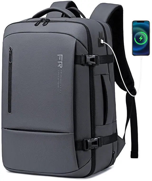 Fenree. geer 17.3 Inch Travel Laptop Backpack for Men, Water Resistant Carry On Backpack with USB Port, Expandable Computer Daypack, Grey Business Backpack for College/Work