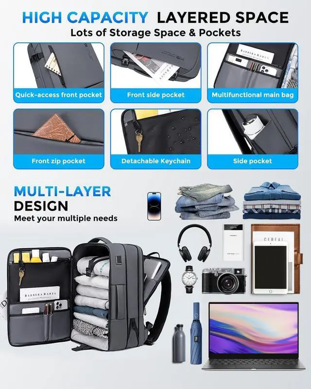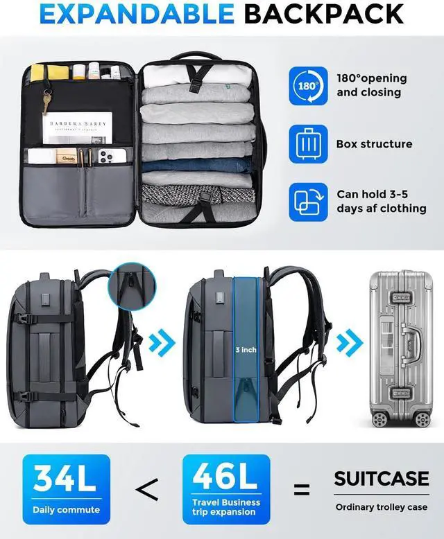 Large Capacity & Well-Organized DesignAdjustable Storage Space, before extended is 34L, dimensions: 12.6x9x19; After extended is 46L, dimensions: 12.6x12x19, fits 17.3 inch laptops; Weight: 3LBS. The versatile carry on backpack has a thoughtfully separated compartments and pockets offer ample room for your laptop, iPad, power bank, A4 files, wallet, cards, clothing, and more