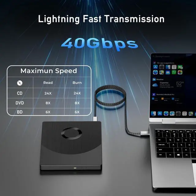 Support 100G Burning Technology: Compared to a external blu ray drive for laptop, this product support 100G BD disc reading & writing, this external blu ray drive features an advanced high-speed 3.0 interface that reaches a maximum speed of 5Gbps, which is 6 times faster than traditional 2.0 (480Mbps). Additionally, the Type-C interface has strong error correction capabilities, impact resistance, and low power consumption, ensuring stable and reliable data transfer. And our drive can read BD discs at speeds of up to 6x, DVDs at up to 8x, and CDs up to 24x
