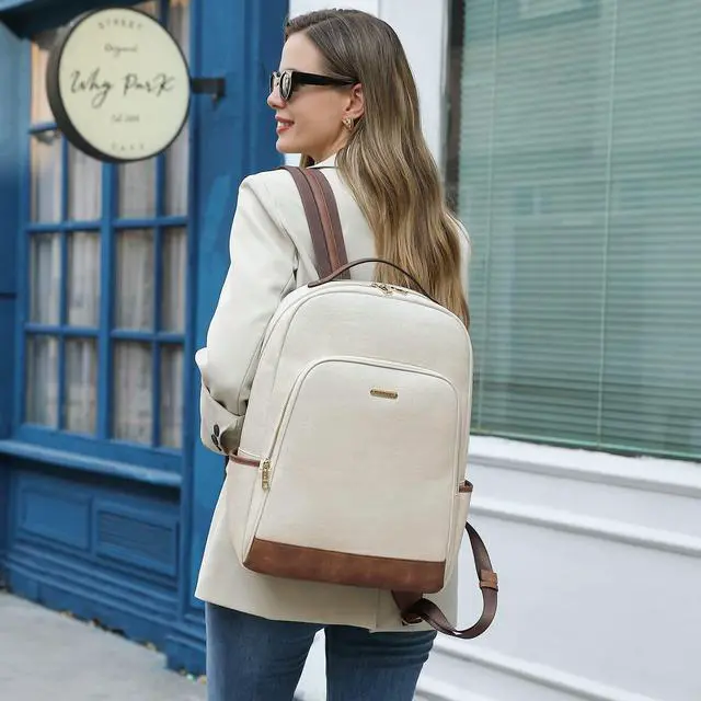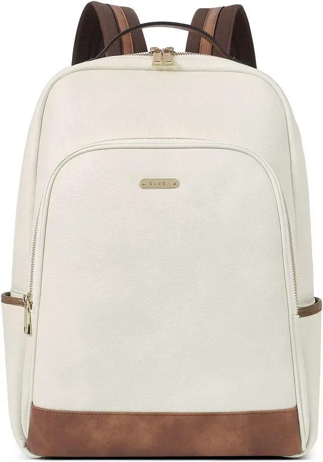CLUCI Leather Backpack for Women 15.6 inch Laptop Backpack Purse Computer Backpack for Travel Airplane Casual Daypack Beige with Brown