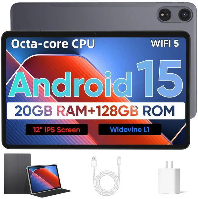 Android 15 Tablet with Octa-Core Processor, 12 Inch Tablets 20GB RAM (6+14GB), 128GB ROM+1TB Expand, 2000 * 1200 IPS Touch Screen, 8000mAh Battery 18W Fast Charge, 2.4 /5Ghz Dual Band WiFi - Black
