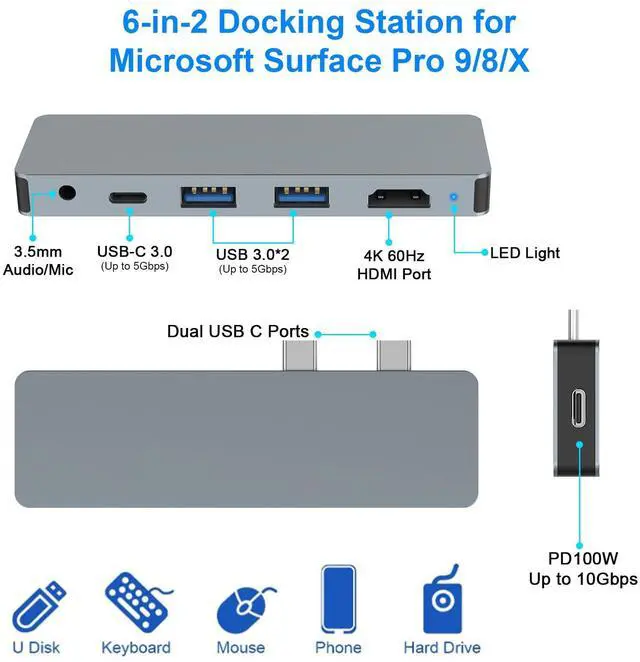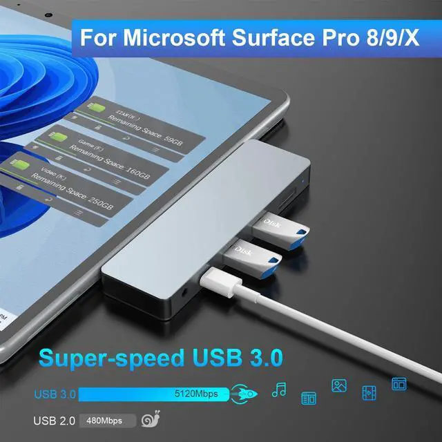 Dual Super Speed 5 Gbps USB 3.0 Port2 * USB 3.0 ports, Surface Pro 8/9/X hub allowing you to connect your keyboard, mouse, USB drive, USB hard drive and more to the Surface Pro8/Pro9/ProX with up to 5Gbps data transfer speeds, backwards compatible with USB 2.0 and below.