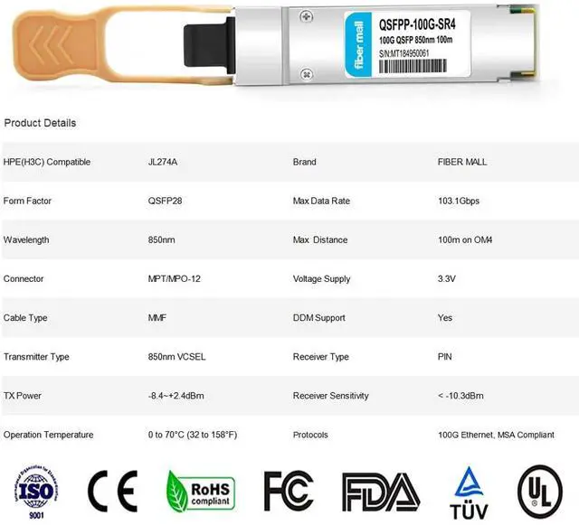 100G QSFP28 SR4 for HPE H3C JL274A, 100GBASE-SR4 QSFP28 Optical Transceiver Module 850nm 100m DOM MTP/MPO DOM