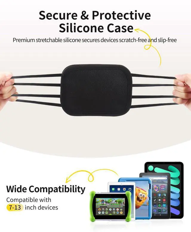 4 Pack Upgraded Tablet Holder for Car - Fit for all 7 -12.9" Tablets The car tablet holder uses a new Upgraded material rubber. After up to 100 repeated tests, the rubber has high elasticity and is durable and firm. The upgraded V*elcro has high-strength stickiness, and the force-bearing area of the V*elcro is increased, which can better fix your device on the back seat of the car stably, without worrying about the device falling or being unable to stabilize your device.