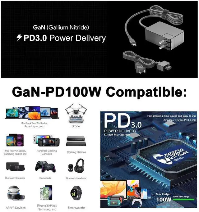 Wide CompatibilityThis 100w charger is compatible with a range of usb-c products, including Nimo 17.3 FHD N172 AMD R9-6950H Laptop,Nimo N155 N155B N156B N156 N156L N153 N154 15.6'' FHD IPS Business-Gaming-Laptop-Computer PC. dewalt 20v dcb094k charger,GOOLOO GT4000S GT4000 Jump Starter 4000A Car Jumper Starter,Fit for Samsung Galaxy Book5 Pro 360 NP960QHA-KG1US Laptop and other surface models with usb-c charging port devices. Also fit j5create USB Type C Docking Station,TOBENONE USB C Docking Station,M4 MacBook Air/Pro, Dell Latitude XPS, HP, Lenovo, Steam Deck, Gaming Laptop,Chromebook, Tablets, Smartphones, Smartwatches and All USB-C port devices