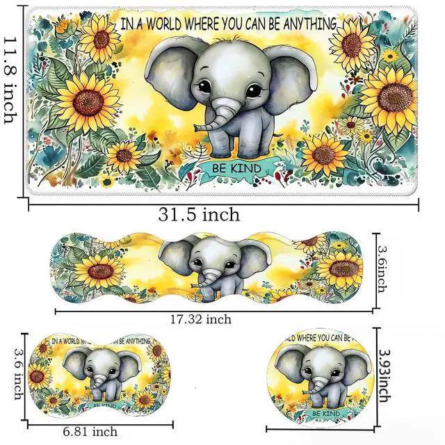 DHEEBFWE Keyboard Mouse Pad Set,Large Desk Pad+Keyboard Wrist Rest+Mouse Pad Wrist Support+Coaster,Easy Typing Pain Relief Non-Slip Mousepad Wrist Support Mousepad Set Home Office,Sunflower Elephant