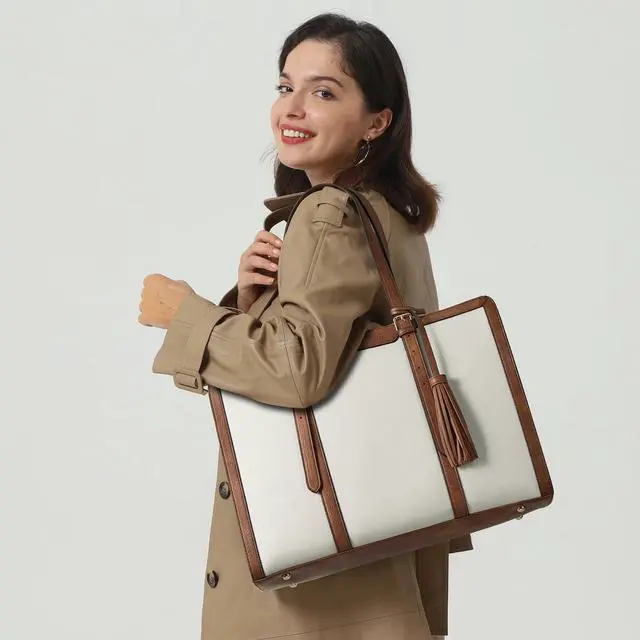 Tote Bag with Top Material -- This laptop bag for women is made of high-end PU leather, which has softer touch and longer service life. With golden color hardware and wear-resistant fabric lining, all these highlight the classic design and excellent quality of this briefcase.