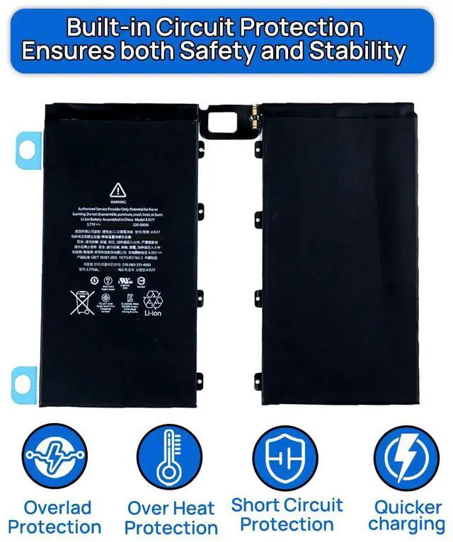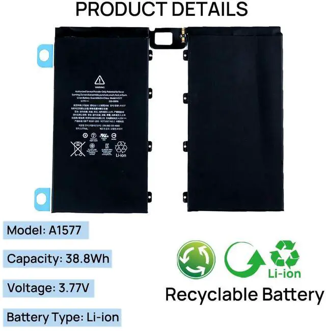 Battery SpecificationsModel:A1577 ; Battery Type: Rechargeble Li-ion; Capacity: 38.8 Wh/10307mAh; Voltage: 3.77V; Battery life: Up to 500 recharge cycles.