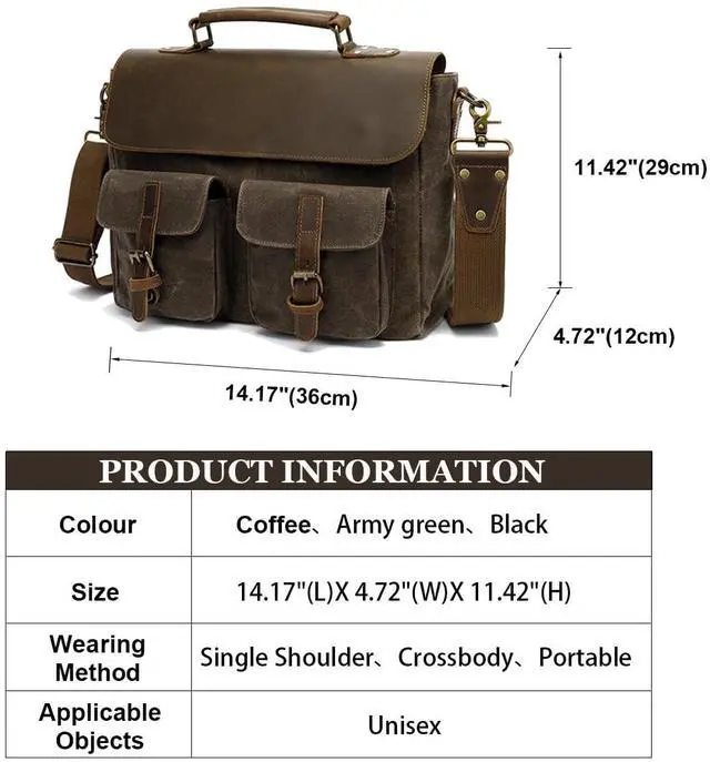 MaterialThis briefcase is made of high-quality wax dyed canvas fabric,which is waterproof,durable,has a good touch,lightweight,and portable.The interior is made of comfortable cotton lining. In addition,some designs are made of high-quality leather,with a strong texture and comfortable touch,such as a carrying strap,outer pull tab,and belt buckle.