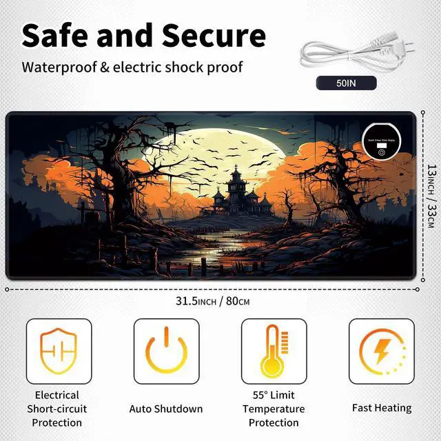 BREIDMKFM Warm Desk Pad,Heated Desk Pad Mouse Pad,Warm Mouse Pad Gaming,Office Desk Mat,with 3 Heating Levels & 3 Hours Auto Shut-Off,Leather 31.5" x 13"Foot Warmer Keyboard Mat,Halloween Night Forest