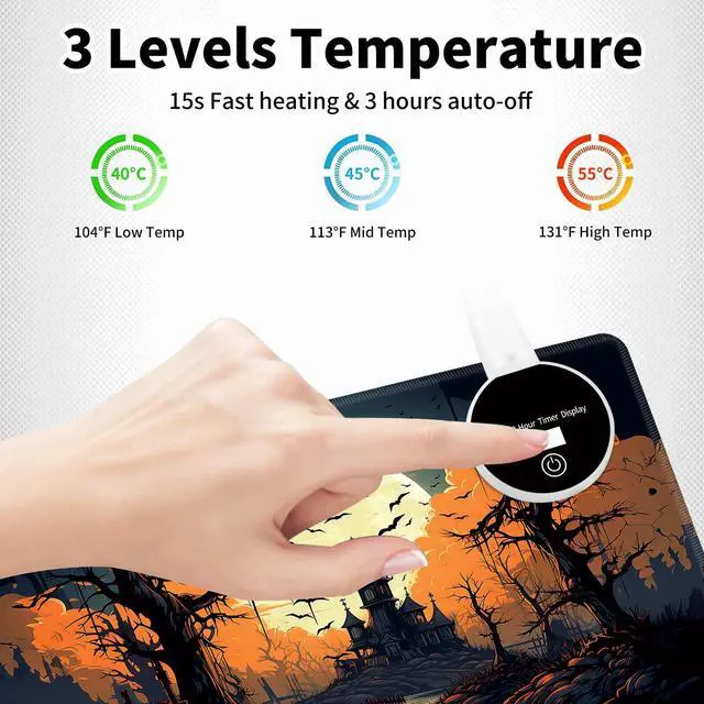 • 3 Levels of Temperature & Auto Shut Off:The heated gaming mouse pad offers three temperature settings (40°C, 45°C, and 55°C with a ±5°C range) or ( 104, 113, 131 ( ± 9) ),touch the middle switch to adjust the level,which quickly warms up within 15s and and heating area is over than 95%,high heating efficiency,heating stable and uniform.The computer mouse pad will automatically shut down 3 hours after power on,don't worry about forgetting to shut it down