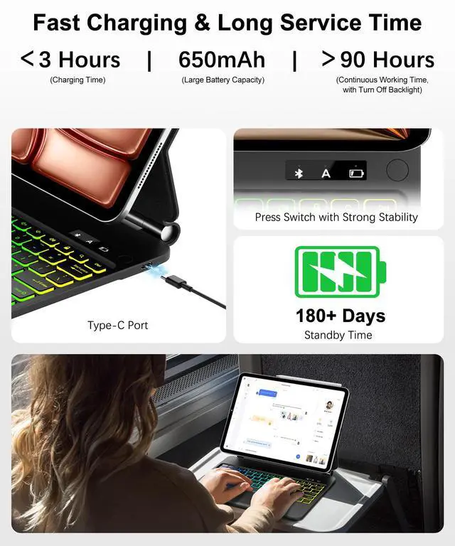 650mAh Massive Battery - Dominate productivity: Our magic keyboard ipad air 13 inch packs a 650mAh battery30% larger than standarddelivering 200+ hours of use. Adjustable backlight (3 levels) ensures all-day typing. Ideal for travel on your ipad air 13 inch m3 case keyboard.