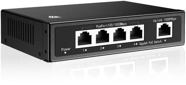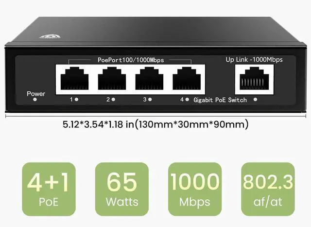 [4x PoE Gigabit Ports + 1x Uplink Port]: Unmanned PoE switch with 4 10/100/1000 Mbps RJ45 PoE+ ports and 1 Gigabit Ethernet Uplink port, 4 PoE+ ports providing up to 30W per port, total PoE power budget 65W.