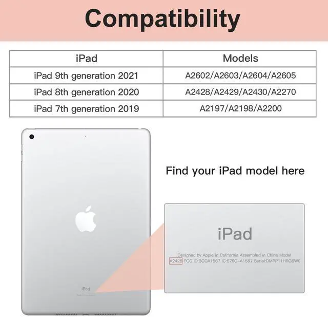 Designed for 10.2-Inch iPad 9th/8th/7th Generation (2021/2020/2019) [ Fit iPad Models: A2602 / A2603 / A2604 / A2605 / A2270 / A2428 / A2429 / A2430 / A2197 / A2200 / A2198 ]. NOT compatible with any other iPad models