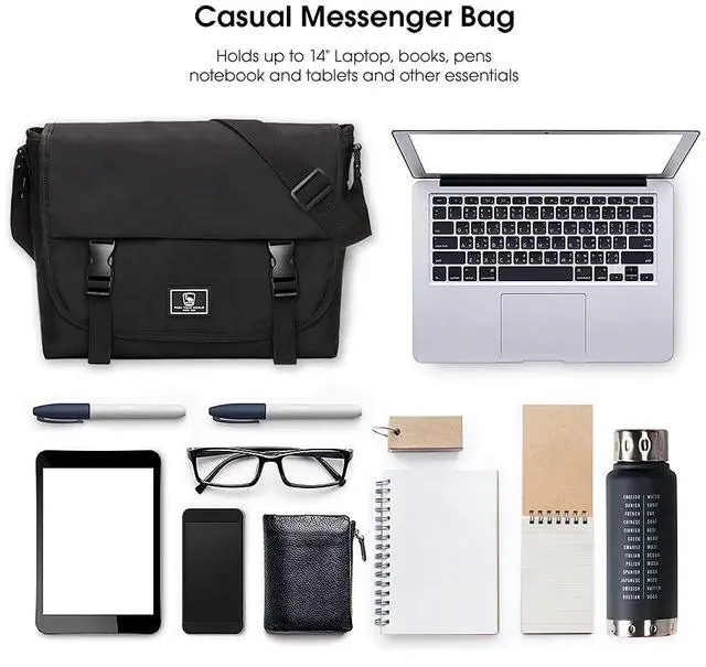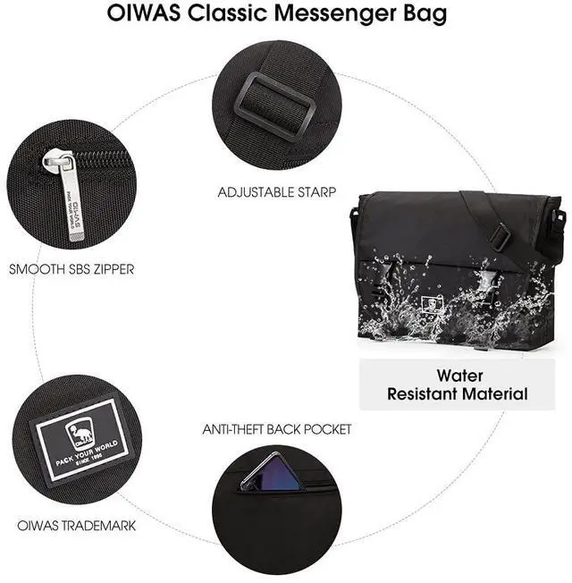 Daily essential needsThe OIWAS Messenger bag size 15.7*4.3*10.2 inch, capacity of 11.4L. Fits up to 14-inch laptop, hold daily essential like tablet, notebooks, water bottle, wallet, and phone etc,.
