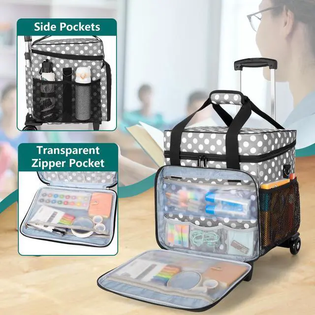 LUXJA Rolling Teacher Tote Bag with Bottom Support Pad, Multifunctional Teacher Bag with Detachable Dolly (Patented Design), Polka Dots