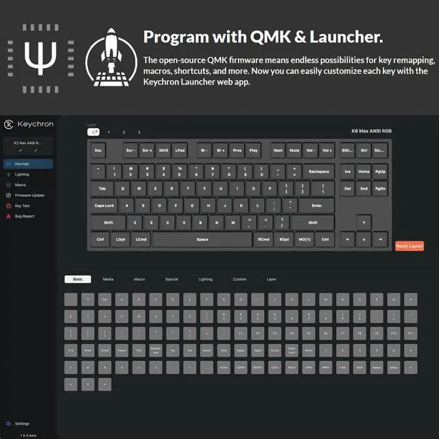 Program with QMK & Launcher - The open-source QMK firmware means endless possibilities for key remapping, macros, shortcuts, and more. Now you can easily customize each key with the Keychron Launcher web app. N-Key Rollover (NKRO) for both wireless and wired modes.