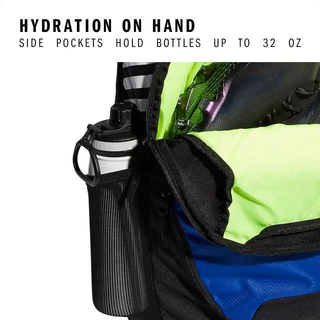 Two side mesh water bottle pockets that fit up to 32 oz bottles