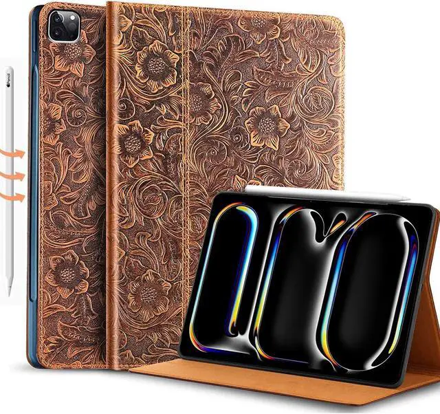 Gexmil Genuine Leather Case for iPad Pro 13 Inch M4 2024 with Adjustable Stand, Protective Shockproof Premium Leather Smart Folio Cover Auto Sleep/Wake Anti-Slip, Flower Brown