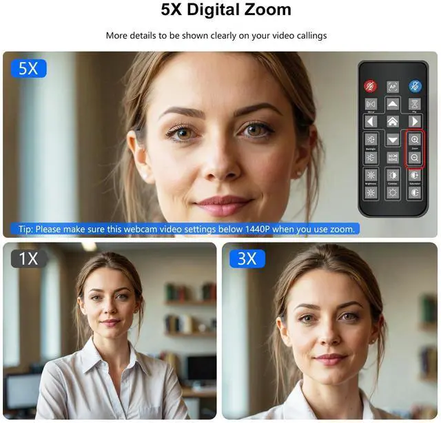 [5x Digital Zoom (under 1440P)] Get clearer images with the included remote contro. The 5x digital zoom works when this webcam video setting is set to 1440P or below on video, allowing you to highlight details during your presentations.