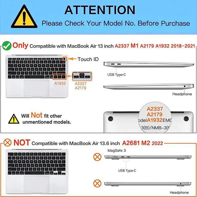 ONLY Compatible with 2018-2022 Release Newest MacBook Air 13 inch with Retina Display and Touch ID (Model : A2337 M1/A2179/ A1932). Not compatible with other MacBook model. Please kindly check model number ""A1xxx"" on the back of the MacBook before your purchase,make sure you choose the exact same model number.