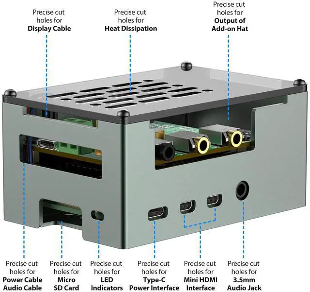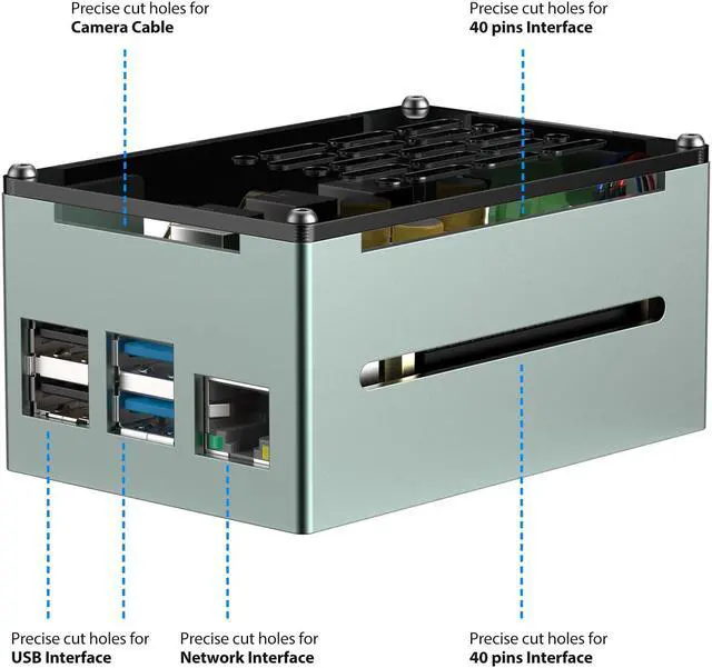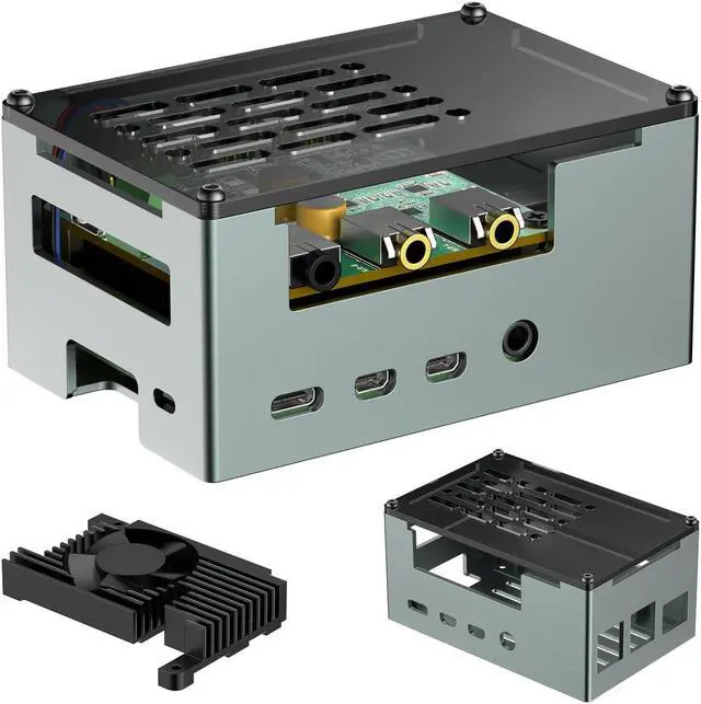 Raspberry Pi 4 Case with advanced cooling: integrates a 3510 PWM ultra-quiet fan and a large passive heatsink for superior heat dissipation, ensuring stable performance under heavy computational loads or continuous operation.