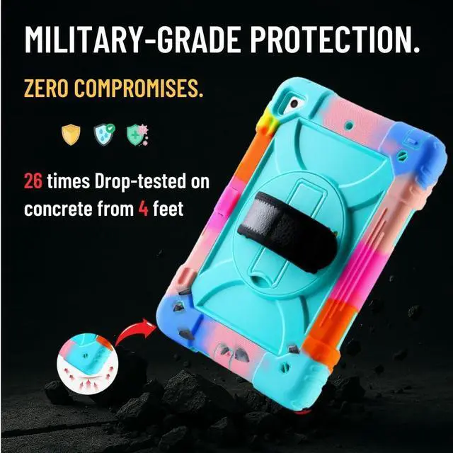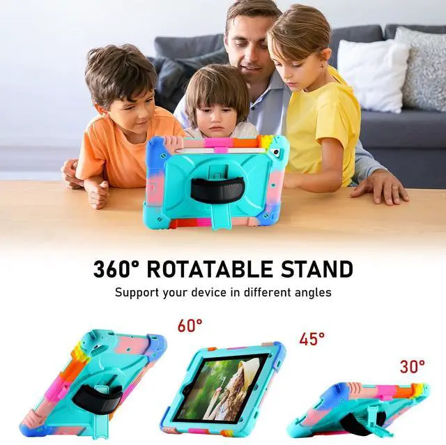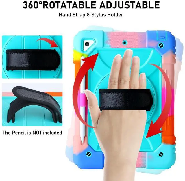 Vteutu Case for iPad 9.7 6th/5th Gen, Air 2, Pro - Rugged Protective Cover with 360° Rotating Stand, Shoulder & Hand Strap, Pencil Holder (Colorful Aqua)