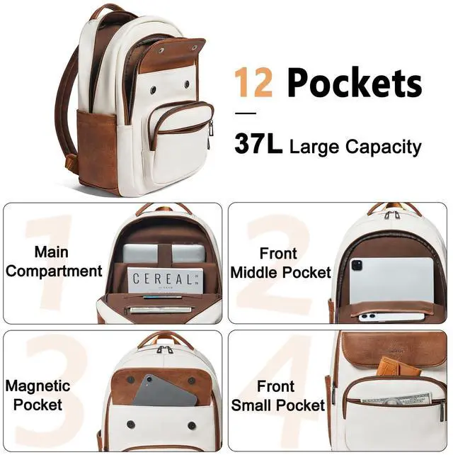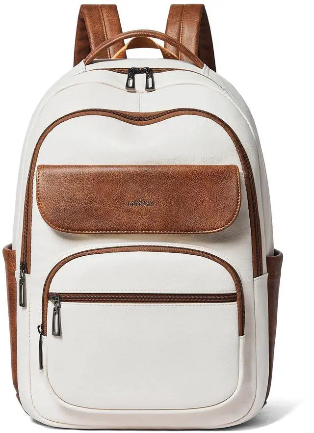 Leresas 37L Backpack Purse for Women Men for Work Travel Back Pack Purses Vegan Leather Laptop College Daypack Shoulder Bag Beige