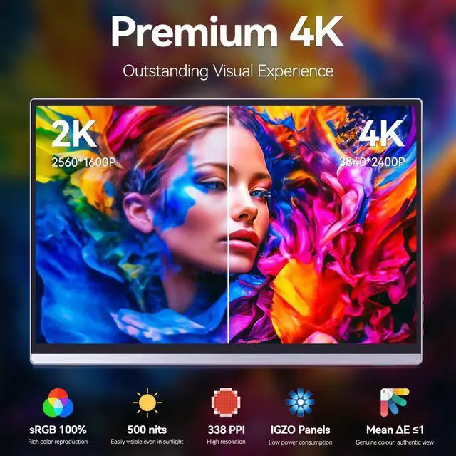 4K IGZO MONITORCompared To Other's 4k (3840x2160) IPS Screen,Intehill Portable Laptop Monitors 4k (3840x2400) IGZO Screen Delivers Sharper, More Detailed Images, Higher Brightness, Improved Color Accuracy, And Less Power Consumption.