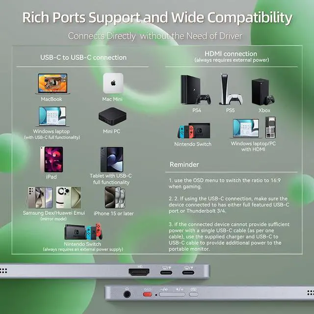 Versatile ConnectivityIntehill 4k Portable Monitor Features Dual USB-C Ports, a HDMI Port, and a 3.5mm Audio Jack for Seamless Connection To Various Devices. HDMI Ensures Compatibility with Devices That Only Support Traditional Video Output.