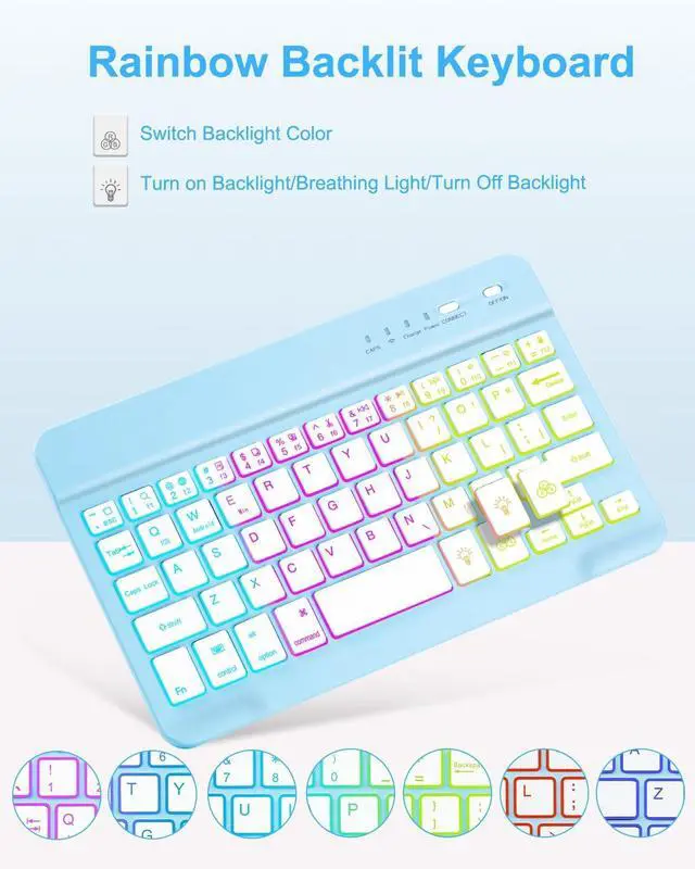 Rainbow Backlight, Multi-Function KeyboardSuitable for iPad RGB rainbow backlight Bluetooth keyboard, 7 adjustable backlight colors, breathing light backlight mode can be automatically switched. The backlit keyboard can be used in the dark, providing a comfortable typing experience. Rich function shortcut keys allow you to use iPad more efficiently & comfortably, such as editing documents, navigating applications, creating presentations.