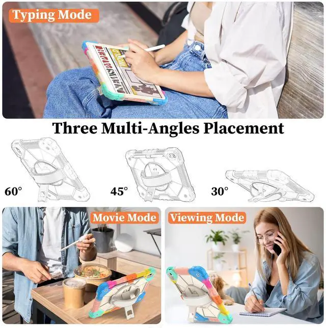 360° Rotating Hand Strap Stand: The iPad covers designed with 360° rotating stand can bear heavy weight iPad and can be folded without taking up space, optimal diferent angles to be convenient for watching video, typing, drawing at home and outdoor travelling.