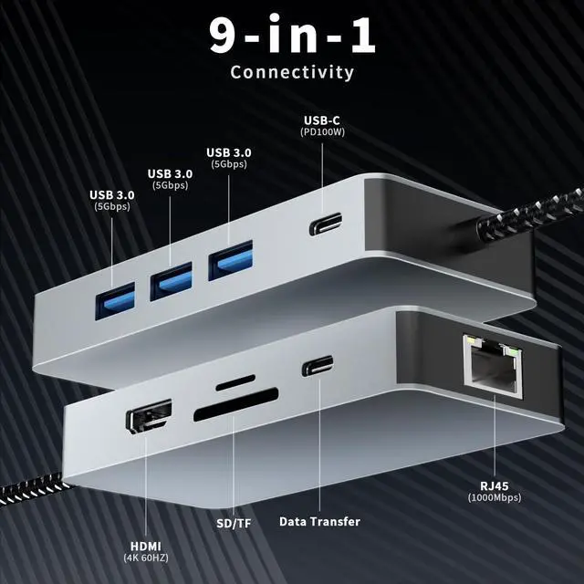 9 IN 1 USB-C Hub: macbook pro adapter with HDMI make it possible for you to connect to a display screen or TV for 4K 60Hz video output. With three USB 3.0 Port, there is also a 1000Mbps Gigabit RJ45 ethernet port, SD and TF card readers, and one USB-C data transfer Port and one PD 100W Charging port. A top choice for those in need of a usb c multiport adapter that delivers speed and versatility.
