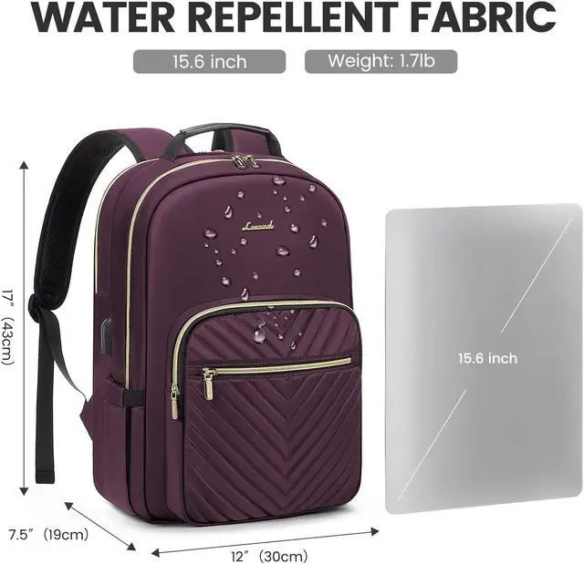Upgraded Laptop Backpack Women: Classic V-shaped embroidery thread. Upgraded double LOVEVOOK no-slip metal zippers,water resistant Nylon fabric with polyester lining, ensures long lasting usage. Total of 4 compartments and 16 pockets for your computer,A4 folder,bottles,umbrellas,clothes,work supplies,college supplies and travel essentials.Dimensions: 12"L 17"H 7.5"D, Weight: 1.7lbs.