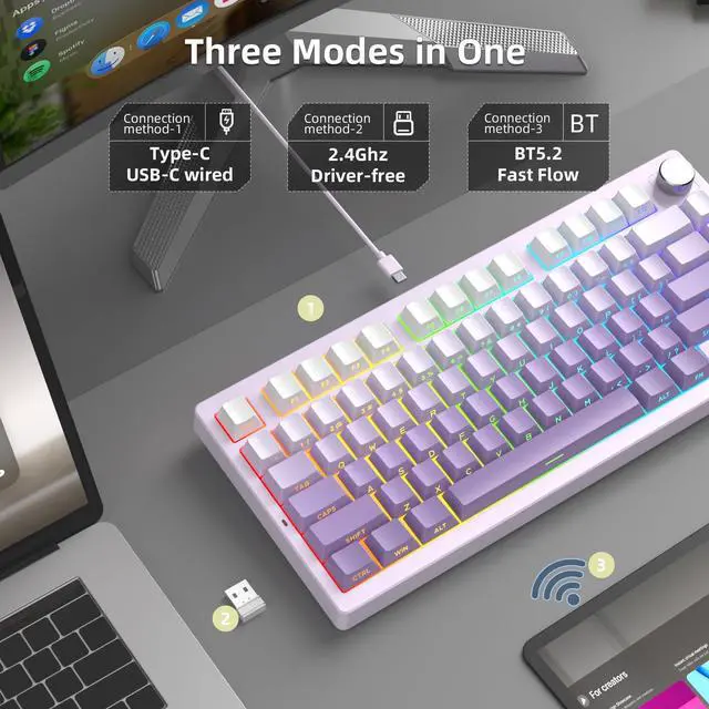 Triple-Mode Connectivity Keyboard: The MageGee Light 75 wireless mechanical keyboard supports seamless switching between Bluetooth 5.0, 2.4GHz wireless, and USB-C modes. The USB-C cable is detachable for versatile use across multiple devices. Stable connections and low latency deliver a smooth user experience.