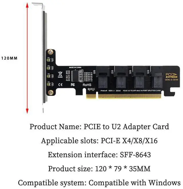 PH49 PCIe 4.0 X16 to 4-port U. 2 NVME SFF-8643 SFF-8639 Expansion Card Support X4 X8 X16 Slot Motherboard with PCIE Split Function