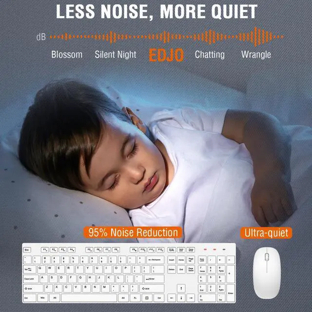 Wireless Keyboard and Mouse Combo, EDJO Silent Full Size Cordless USB Keyboard Mouse, 2.4GHz Lag-Free, Long Battery Life, for Computer, Laptop, PC, Chromebook, Windows (White, 1 Pack)
