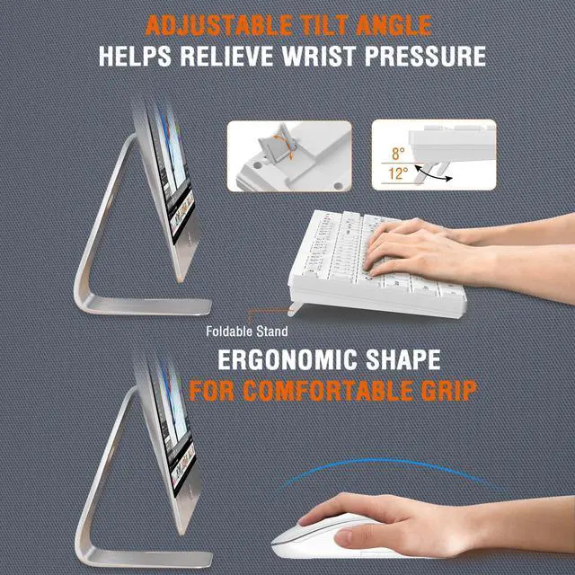 Type in Comfort & Smooth The foldable stand of the keyboard provides two tilt angles, which help relieve wrist pressure and increase comfort. 3mm short keystroke distance, lighter keystroke force, and standard 104 keys full size American QWERTY layout make typing more sensitive, smooth, and soft.