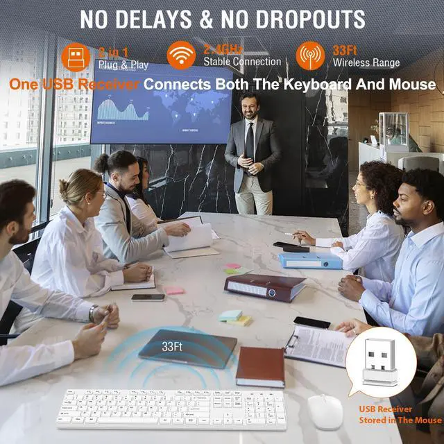 Lag-free, Plug & Play2.4GHz wireless technology provides automatic frequency recognition and stable signal, plug and play, connection range up to 33ft without any delays. Cut the cord and enjoy the freedom.Keyboard and mouse , .