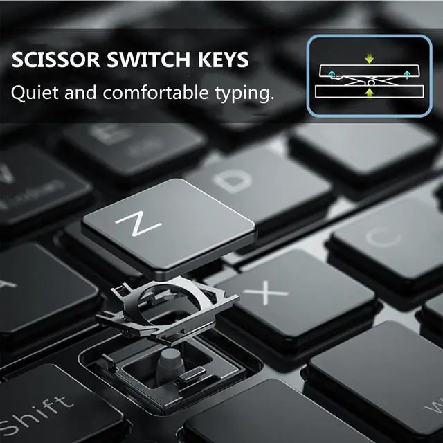 Scissor-Switches Quiet TypingThe quiet and responsive scissor switches low-profile keys offer fluid, laptop-like efficiently typing. Non-slip at the bottom, so that you can fully concentrate on your work!