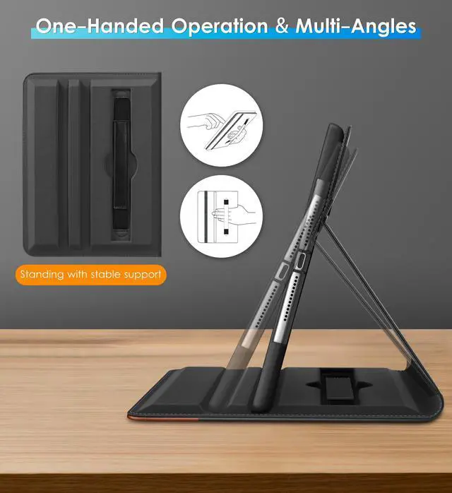 Internal embedded 360-degree rotating design, flexible rotation to any angle for comfortable watching movies or typing. Built-in leather hand strap (one-handed operation).