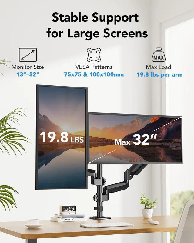 Wide Compatibility: This dual monitor mount is compatible with most 1332 flat or curved monitors, and the weight range of the screen must be from 4.4 lbs to 19.8 lbs, the monitor must have VESA mounting patterns 75x75 or 100x100mm. Please verify the screen size, weight, and VESA pattern of your monitor before purchase.