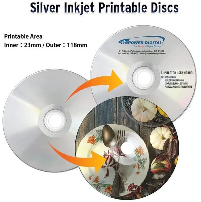 PlexDisc recordable CD media offers superior quality and performance. They are perfect for recording audio, data, games, and more. The PlexDisc recordable CD media is affordable and works in a wider array of duplication and recording devices compared to cheaper, less reliable media options. Plus, the silver inkjet printable surface works across all known optical disc inkjet printers providing a vibrant printed image that can cover the entire disc surface to the center hub. The colors are more colorful and the Black is more pronounced with the PlexDisc 52x 700MB / 80 min Silver Inkjet Hub Printable CD-R media.