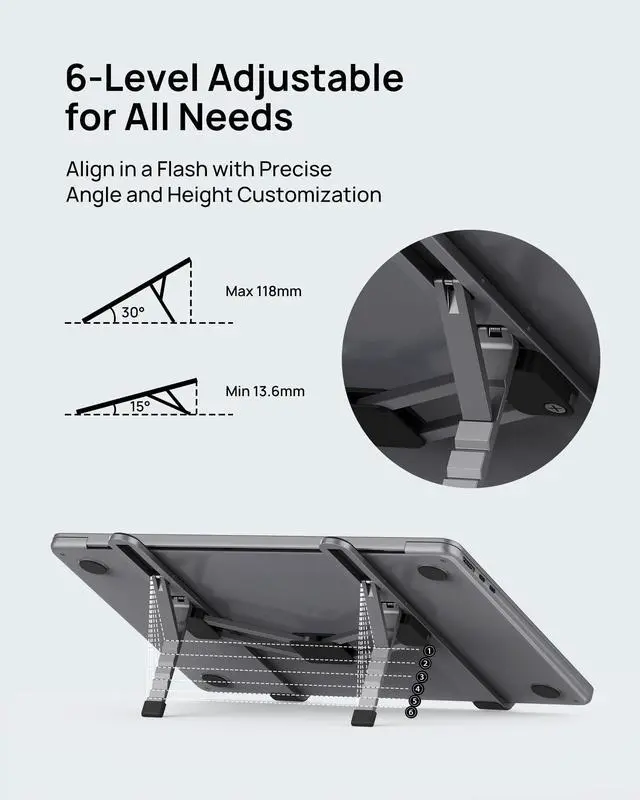 Innovative & Ultra Compact The SODI 315 foldable laptop stand weighs only 6.1 oz (173 g) (iPhone 16 Pro Weight: 7.9 oz (199 g), and the folding size is 9.9 x 1.7 x 5.3 inches (249.6 x 43.8 x 13.6 mm), making it compact and easy to carry. Perfect for business trip, daily travel, library, cafes work, etc.