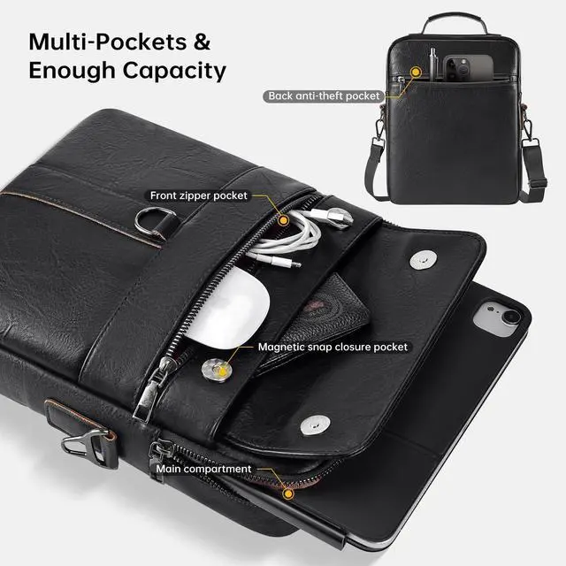 Multi-Pockets & Enough CapacityThe iPad sleeve bag features a main compartment with three inner separator pockets, a magnetic snap closure pocket, a front zipper pocket, and a back anti-theft pocket. This design ensures secure and convenient storage for your cell phone, earphones, passport, keys, Kindle, wallet, credit card, iPad, and sunglasses.