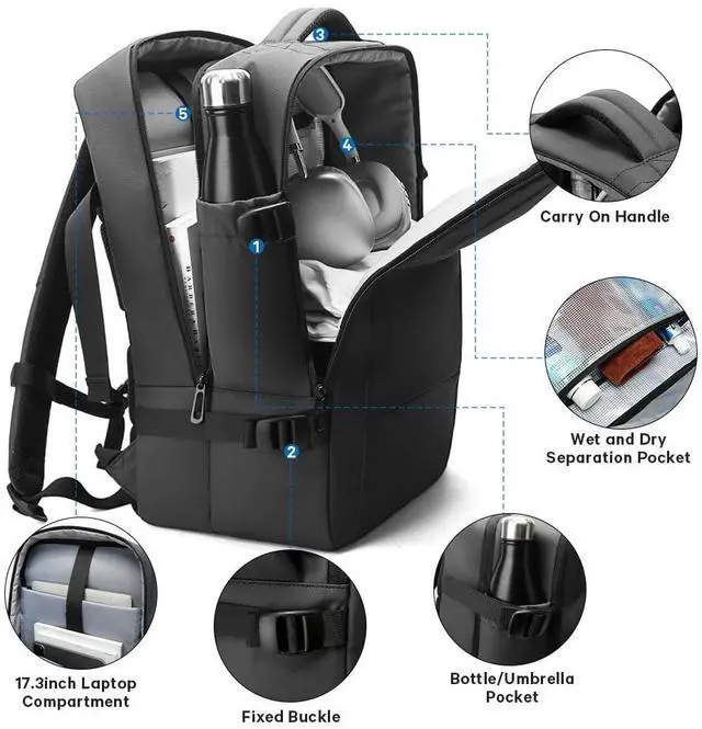 Easy To Carry On:The backpack with many compartments, organization and expansion.The main pocket can hold your travel goods,fit 5-8pcs clothes. It is cool that there is a wet pouch to liquids.Front compartment can also hold magazines,Ipad and power bank which can charge your phone. 17inch laptop compartment size: 15.3" x 11.4" (please cheak your laptop size),Backpack Back with padded batter can protect your laptop.
