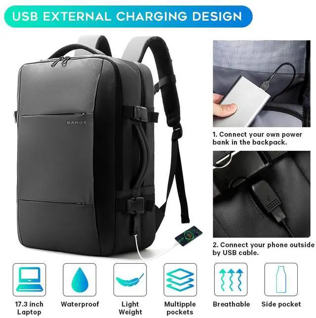USB Charging PortBANGE travel backpackensure a secure long-lasting usage everyday or weekend, it is a great companion for business trip, hiking, travel, camping and other outdoor activities. It is convenient to charge your phone from outside due to there is a USB charging port, and you only need to place a power bank in the backpack.