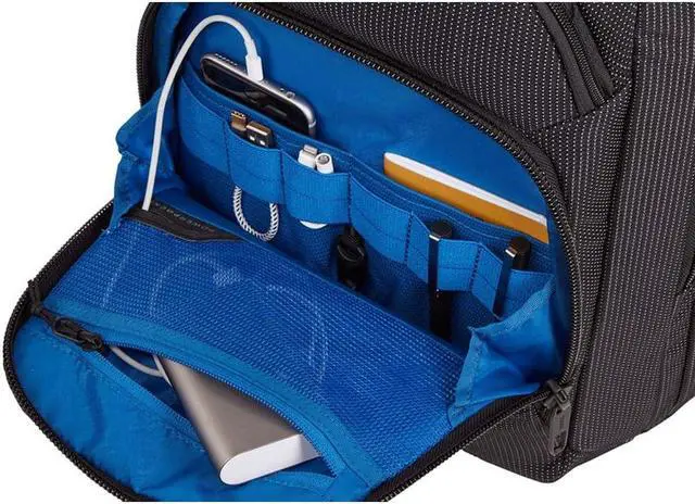 Organize small electronics and accessories in the front panel with slip pockets, elastic loops, a zippered mesh pocket and the power pocket cord management system for charging on the go