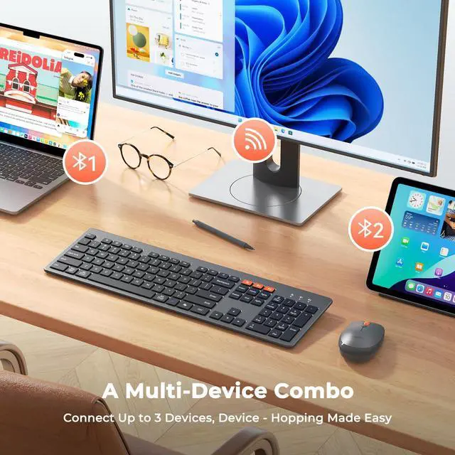 MULTI-DEVICE CONNECTBoth the keyboard and mouse provide 2.4G/BT1/BT2 triple connectivity channels to support up to 3 devices at the same time, and the one-button switching function seamlessly switches between the 3 devices without the need for re-pairing, making the desktop clutter-free and cost-effective.